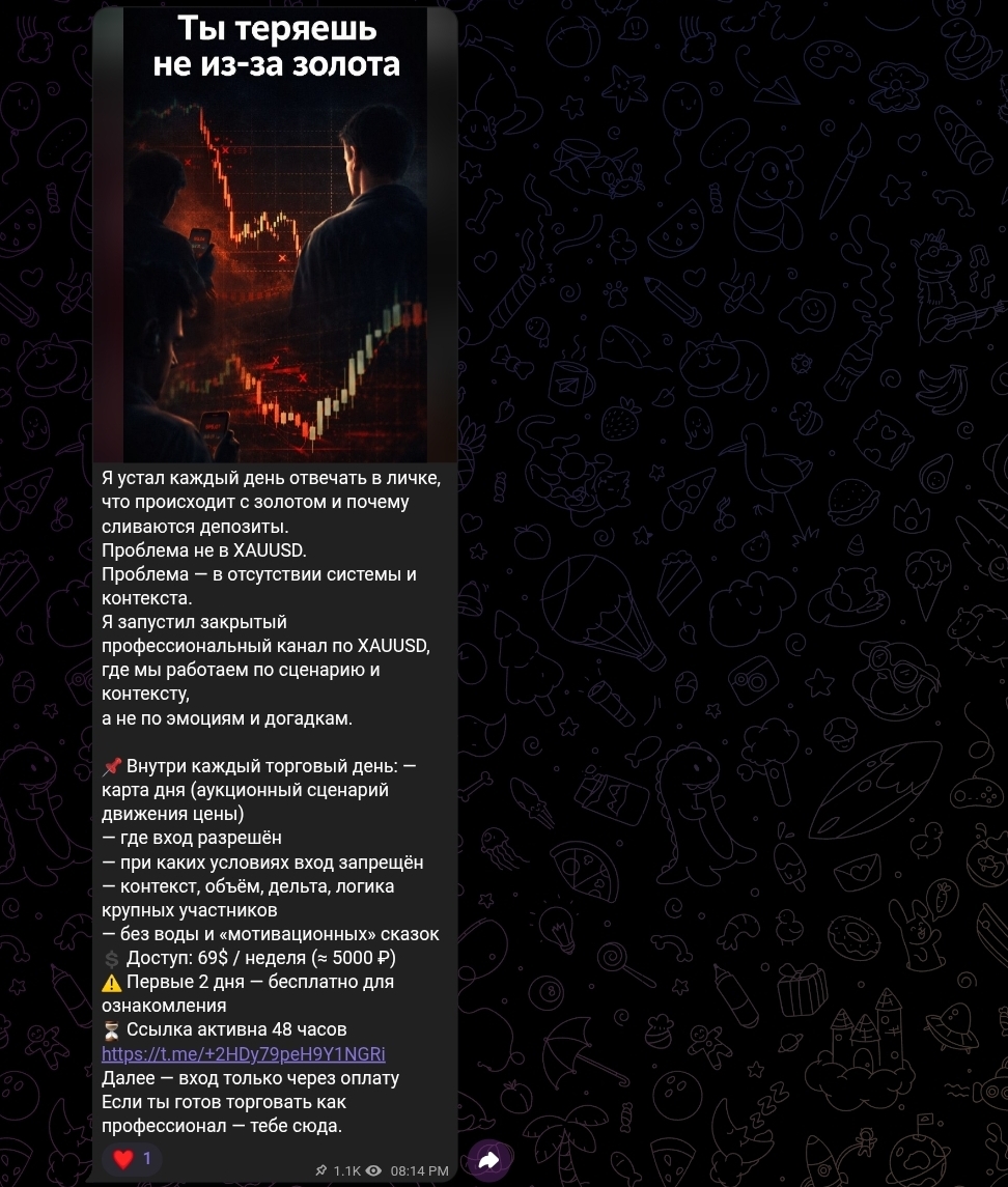 Стоимость доступа к закрытому каналу — $69 в неделю, что составляет порядка 5 000 рублей. Первые два дня заявлены как бесплатные для ознакомления. При продвижении активно используются классические триггеры дефицита и срочности: «ссылка активна 48 часов», «приём закрыт, места ограничены», «вход только через оплату, далее — без вариантов». Такие формулировки создают искусственное давление на потенциального покупателя и ускоряют принятие решения без должного обдумывания.