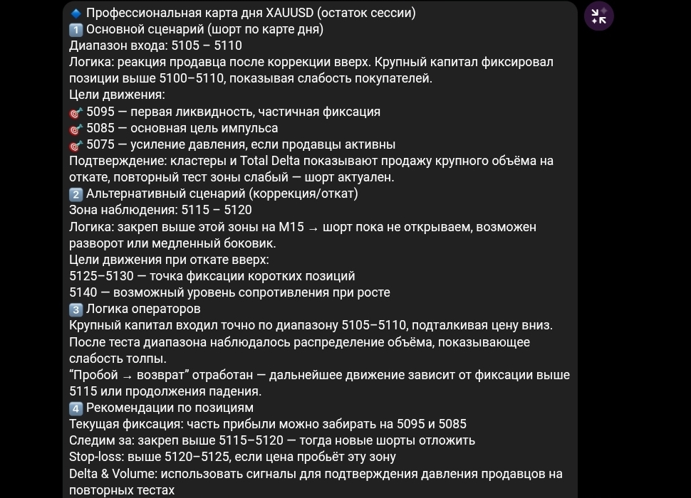 Канал Trading Forex Gold продвигает два отдельных платных продукта. Первый — «карта дня»: аукционный сценарий движения цены на каждый торговый день, контекст, объем, дельта и логика крупных участников. По заявлению автора, этот формат предназначен для тех, кто хочет разбираться в рынке самостоятельно. Второй продукт — канал с торговыми сигналами для тех, кому нужен «чистый результат без лишней информации».