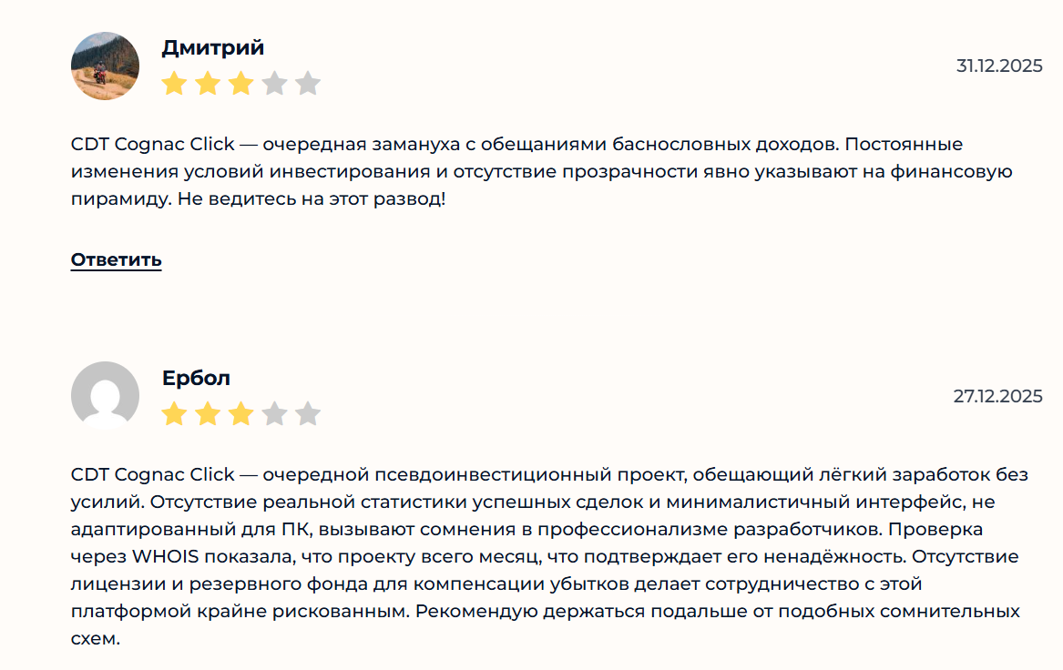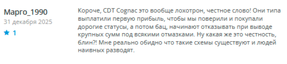 У платформы https qbb cognac click отзывы абсолютно все негативны. Люди жаловались, что компания затягивала их в воронку — сначала давала получить небольшую сумму денег, затем старалась выманить больше, а в конце дожимала вымышленными платежами и блокировала аккаунты.