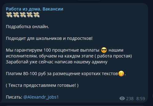Большая часть вакансий выглядит вполне стандартно, но некоторые кажутся очень подозрительными. Вот, например, очень краткое описание, где даже не указана примерная заработная плата. А внизу есть контакт для обращения.