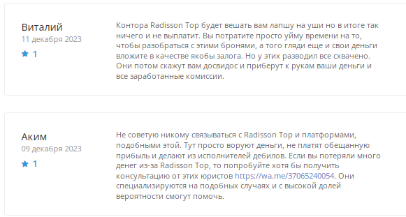 - негативные отзывы от обманутых клиентов Radisson Top Fun;