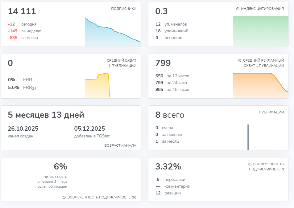 Канал в Телеграм запустили в октябре 2025 года, и хотя он добавлен на TgStat, статистика там неактуальная, ведь показывает более 14 000 подписчиков, а просмотры постов посчитаны неправильно, но видно, что многие покидают проект.Проверка показала, что на канале уже 11 000 пользователей, что говорит о снижении популярности, хотя некоторые публикации набрали более 10 000 просмотров. Комментарии отключены, поэтому узнать мнение участников проекта все равно не получится.