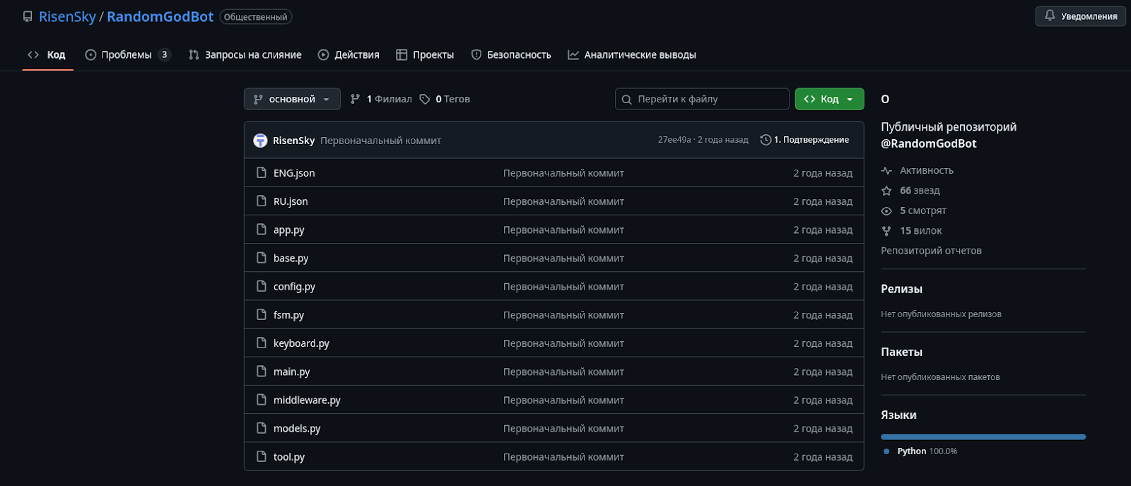 Справедливости ради, код RandomGodBot (или его значительная часть) выложен в открытый доступ на GitHub. Да, это редкий случай прозрачности в нашей сфере, где обычно все скрыто за семью печатями. Репозиторий существует давно, что подтверждает – перед нами не скам-однодневка, созданный вчера для сбора денег. Однако открытый код – палка о двух концах. С одной стороны, любой может проверить, нет ли там бэкдоров. С другой – если автор забросит обновления (а коммиты появляются нерегулярно), уязвимостями могут воспользоваться хакеры, чтобы перехватить управление ботами, которые юзают этот исходник.