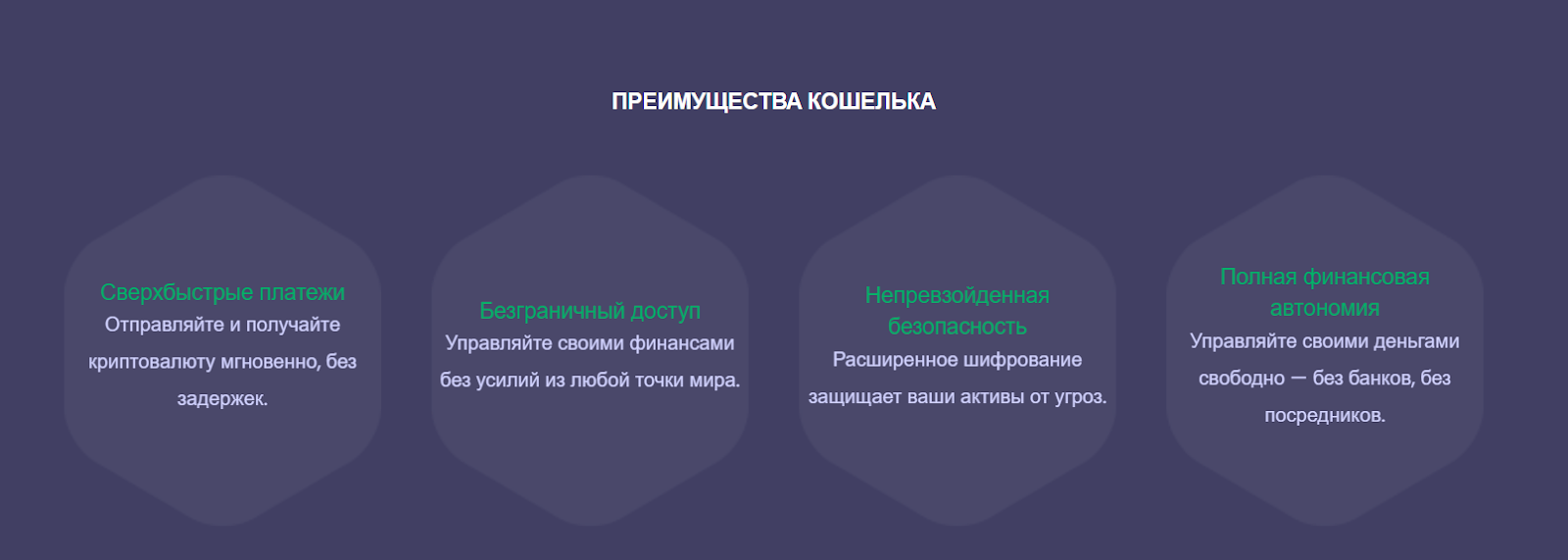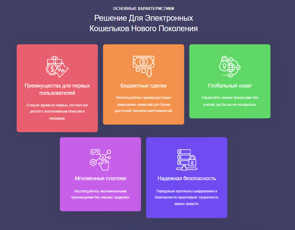 Дальше владельцы решили снова описать преимущества своего кошелька, причем некоторые из плюсов повторились. К ним добавились еще сверхнизкие комиссии, эксклюзивные бонусы и награды. Дальше на этой же странице встречается еще два блока с преимуществами сервиса.