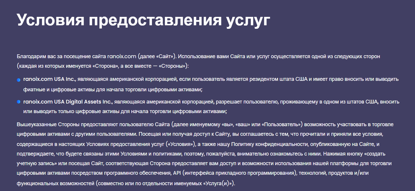 Юридические документы и лицензии на сайте не размещены. Есть только «Политика конфиденциальности» и «Условия предоставления услуг». В них указаны совсем другие компании – ranoix.com USA Inc. и ranoix.com USA Digital Assets Inc. Они тоже выдуманные.