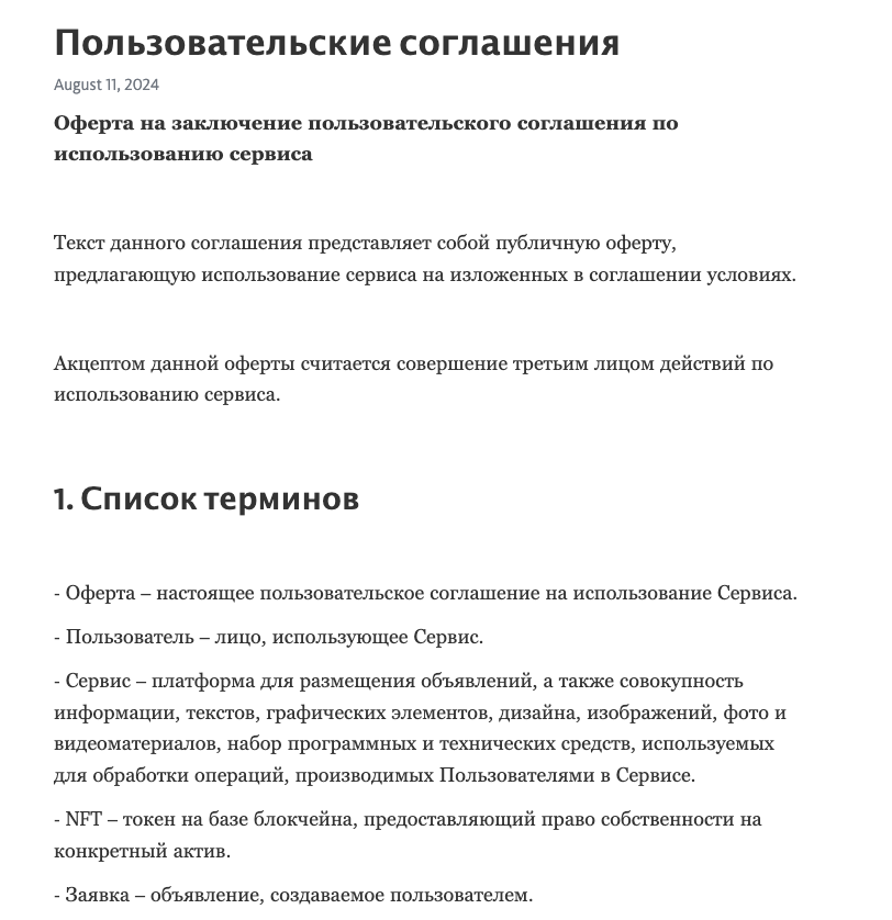 Само Соглашение очень примечательное. В нем вообще не указывается наименование компании. Дело в том, что на этот документ ссылается целый ряд «НФТ-маркетплейсов» из Телеграм. Мы обозревали уже десятки клонов. Да даже у самого этого бота есть несколько вариантов: