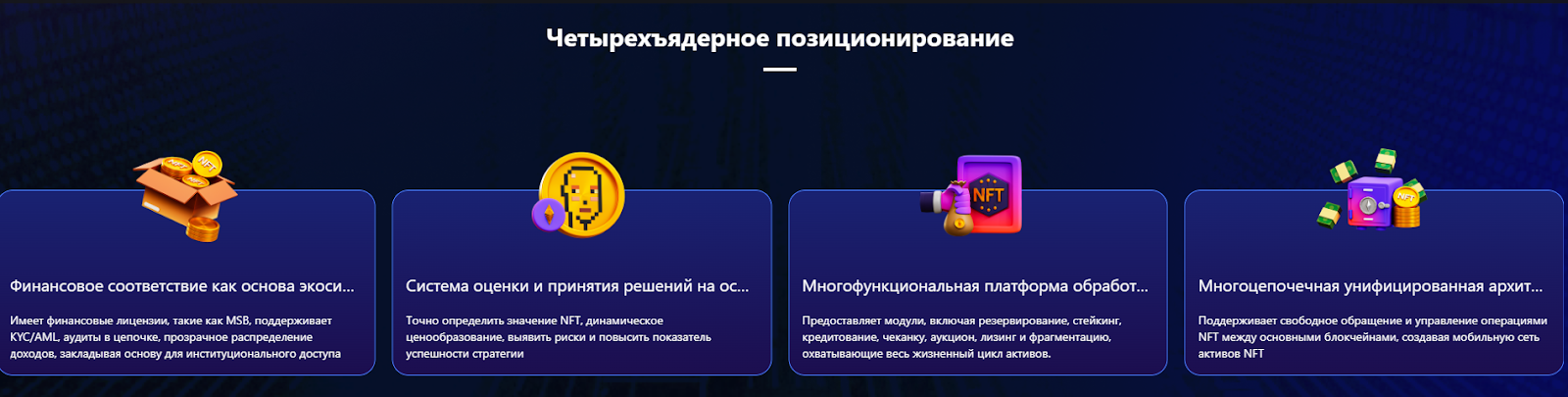 Третье направление – мультичейн архитектура для свободного обращения NFT между блокчейнами Ethereum, BSC, Polygon и Solana. Четвертое – финансовое соответствие с поддержкой KYC/AML и прозрачным распределением доходов.