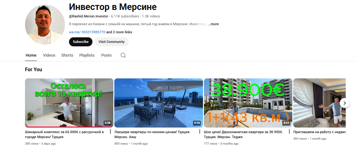 Рашид ведет каналы на разных площадках. YouTube-канал Rashid Mersin Investor собрал более 6 тысяч подписчиков и 1300 видео. В ТикТоке аудитория 15,5 тысяч подписчиков. Инстаграм-аккаунт rashid mersin investor насчитывает 6574 подписчика и 655 публикаций. Канал в Дзене инвестора «Рашид Инвестор в Мерсине», но он пока небольшой – всего 18 подписчиков.