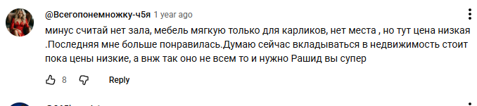 Встречается критика по мелочам. Одна женщина считает, что эти квартиры стоят своих денег, но лучше немного доплатить и купить жилье в хорошем комплексе. Кто-то отметил минус планировки – практически нет просторного зала. Но при этом человек признал, что низкая цена полностью компенсирует эти недостатки.