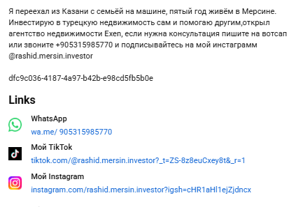 Во всех профилях указан телефон +905315985770 и WhatsApp для связи. Инвестор рассказывает, что помогает людям найти жилье у моря. Работает в Мерсине уже 4 года. Заявляет, что продал более 1000 квартир за это время.