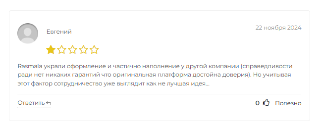 В сети о реальной инвестиционной компании Расмала отзывов мало, контора не заинтересована в российских инвесторах и не рекламирует свои услуги в РФ. Этим и воспользовались мошенники, создавая клона. Однако организаторы скама как раз нацелены на аудиторию стран СНГ и Телеграмм канал ведут на русском языке. В сети мало отзывов о rsmlinvestmentfund, но доверия и положительных комментариев среди них не обнаружено.
