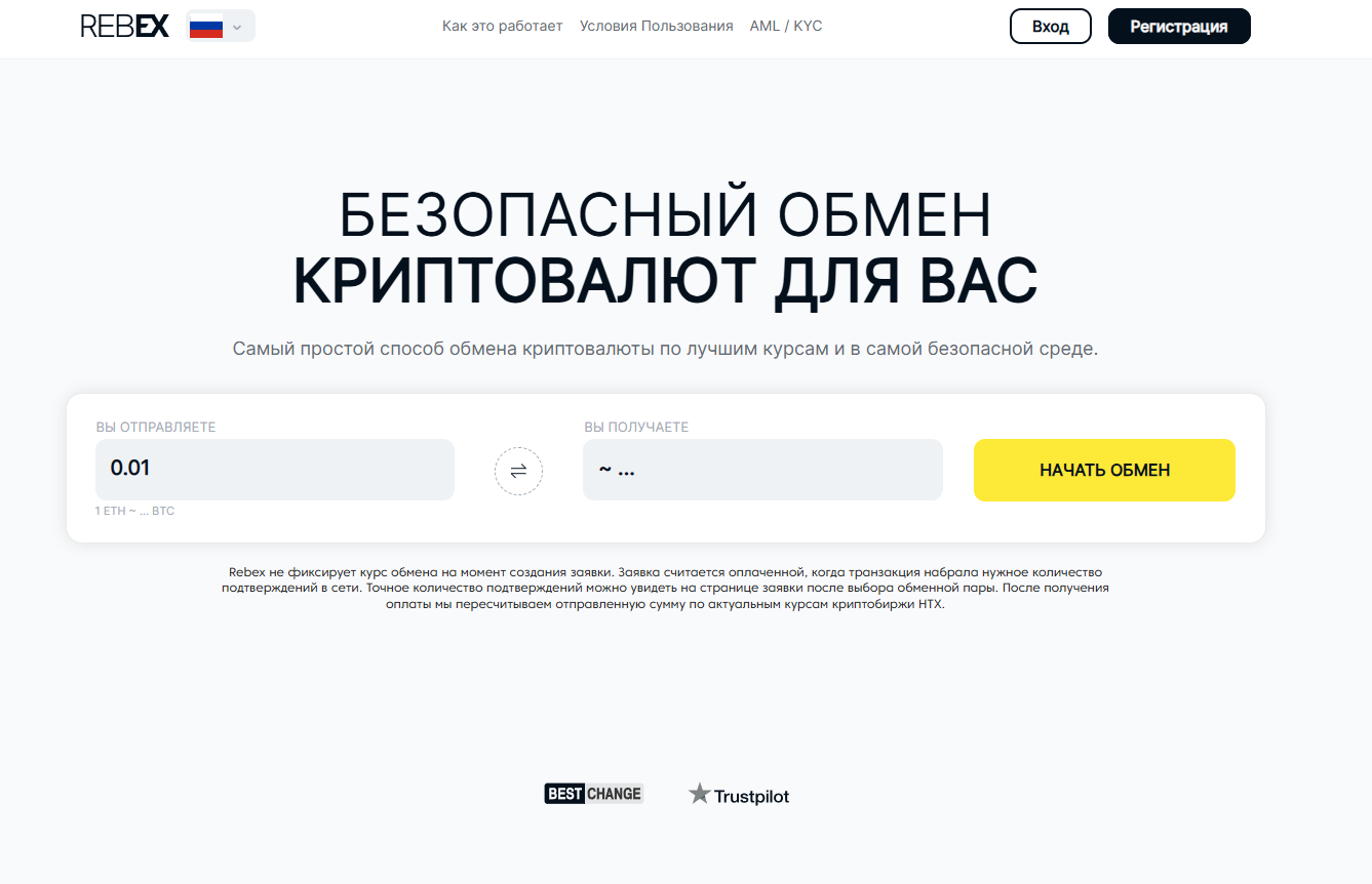 Rebex io – площадка, созданная русскоязычными разработчиками. В целом, криптообменник предлагает стандартные условия. На сайте можно конвертировать практически любую крипту. В обмене не могут участвовать фиатные деньги.