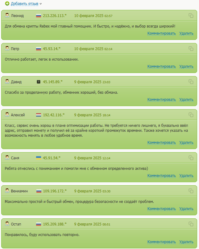Как уже говорилось ранее, много откликов о Rebex io можно прочитать на сайте Bestchange. Здесь у криптообменника только положительные отзывы. Пользователи довольны скоростью обмена, курсом и в целом качеством услуги. По комментариям можно сделать вывод, что служба поддержки на сайте также хорошо работает. Более того, по любым вопросам менеджер дает ответы даже на площадке Bestchange.