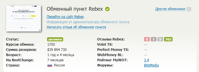 Большим преимуществом сервиса Rebex io является присутствие на сайте Bestchange. Эта площадка ведет рейтинг надежных и удобных обменных сервисов. В него не попадают мошенники и сомнительные организации. Здесь можно найти информацию об обменнике. У Rebex на платформе 702 положительных отклика, что говорит о высоком качестве и отсутствии мошеннических намерений.