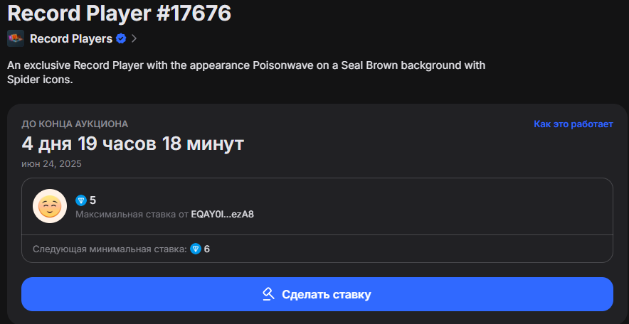 Теоретически тг подарок Record Player можно приобрести и дешевле, участвуя в аукционах. На некоторых площадках открываются торги, которые, как правило, длятся примерно неделю. На текущий момент, например, самая высокая ставка на одно из NFT составляет всего 5 TON. Конечно, скорее всего, эта сумма еще увеличится в несколько раз, но следить за ситуацией все равно стоит.