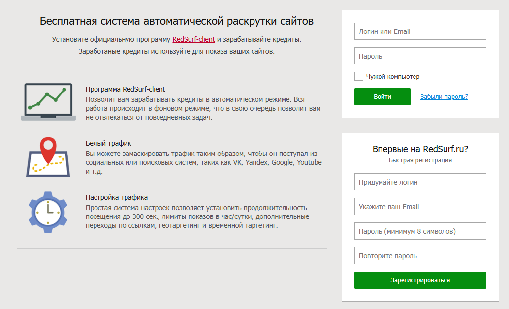 Red surf – российский сервис для автоматического продвижения сайтов. Работает через клиентское приложение, которое ставится на компьютер и управляет процессом из одной панели. По описанию платформы, система формирует трафик и дает настраивать поведение визитов. Можно задать, откуда «приходит» пользователь, сколько времени он проведет на странице и сколько страниц откроет. Компания утверждает, что трафик «легитимный» и выглядит естественно для аналитики.