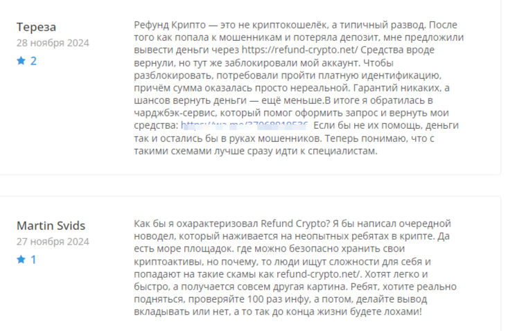 Негативные отзывы о «Рефунд Крипто» были найдены нашей командой. Бывшие клиенты платежной платформы обвиняют администрацию в присвоении средств и блокировке аккаунтов.