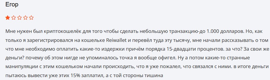 Пользователи Reiwallet утверждают, что после пополнения счета они теряли контроль над деньгами, а для проведения транзакции от них требовали непонятные платежи. В итоге вернуть деньги так никто и не смог. Ключи безопасности пользователям никто не выдавал: зарегистрироваться можно было только по логину и паролю.Reiwallet: отзывы о кошельке
