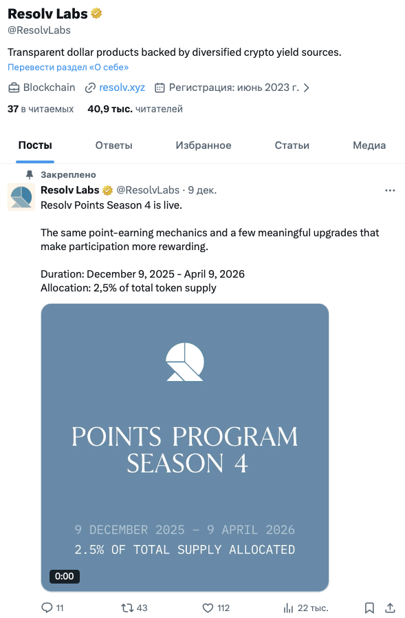 За новостями проекта можно следить на странице ResolvLabs в Twitter. На нее, на 29 декабря 2025-го года, подписаны 40,9 тысяч читателей.