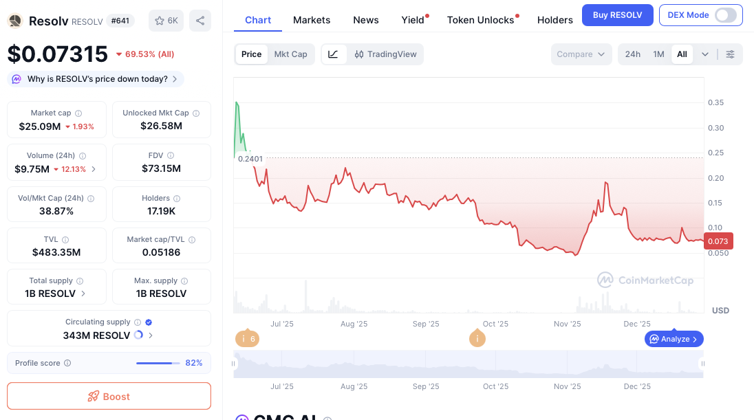 Капитализация монеты, на 29 декабря 2025-го года, составляет 25 миллионов долларов, а суточный оборот превышает 9 млн. Это обеспечивает Resolv Token высокую ликвидность.