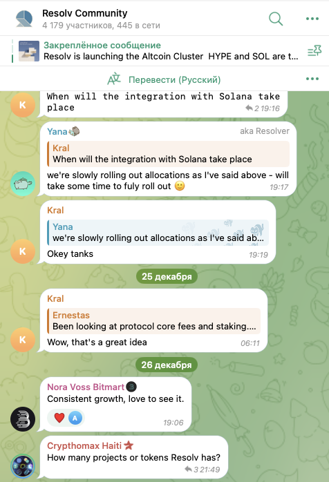 У разработчиков экосистемы есть официальное сообщество в Телеграмме. Оно называется Resolv Community и насчитывает 4,2 тысячи участников, онлайн из которых находятся только около 500.