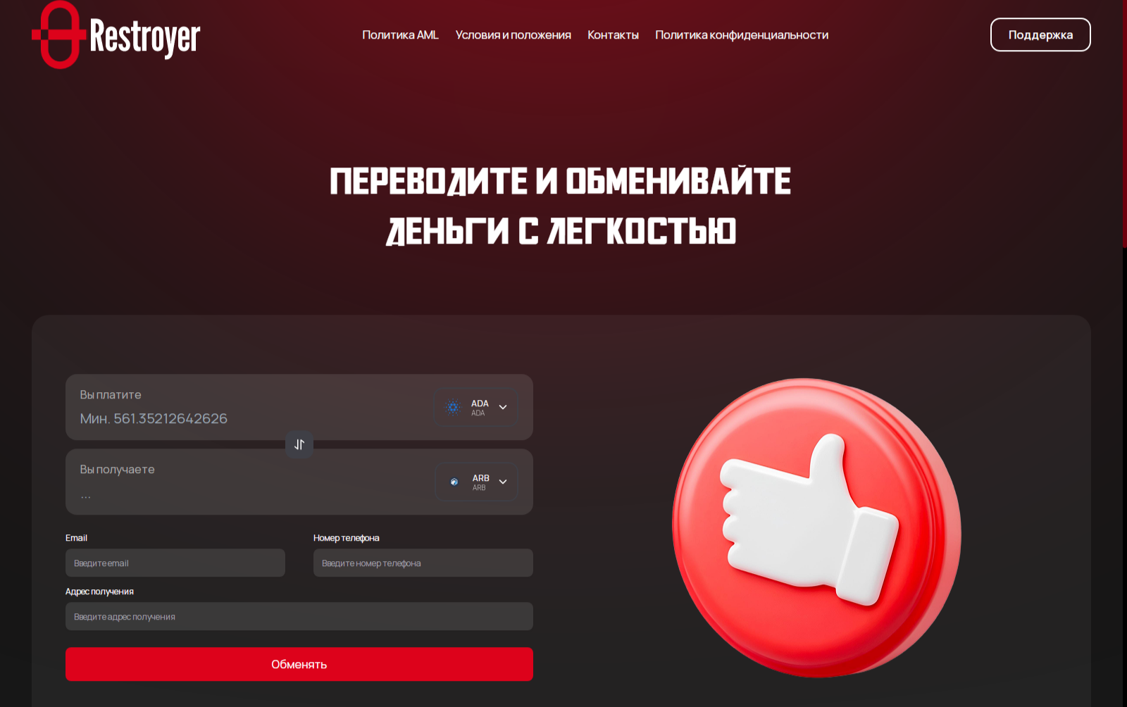 Restroyer — сервис для обмена и перевода криптовалютных активов. Авторы заявляют, что здесь можно быстро, легко и безопасно совершать операции. Популярностью на просторах сети он не пользуется.