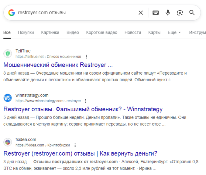 В интернете о ресурсе оказалось мало информации, что показывает его невостребованность. Упоминается обменник Restroyer Com только в разоблачениях и негативных отзывах. Причем написаны они были несколько дней назад. Видимо, проект появился после обновления, то есть всего месяц назад.