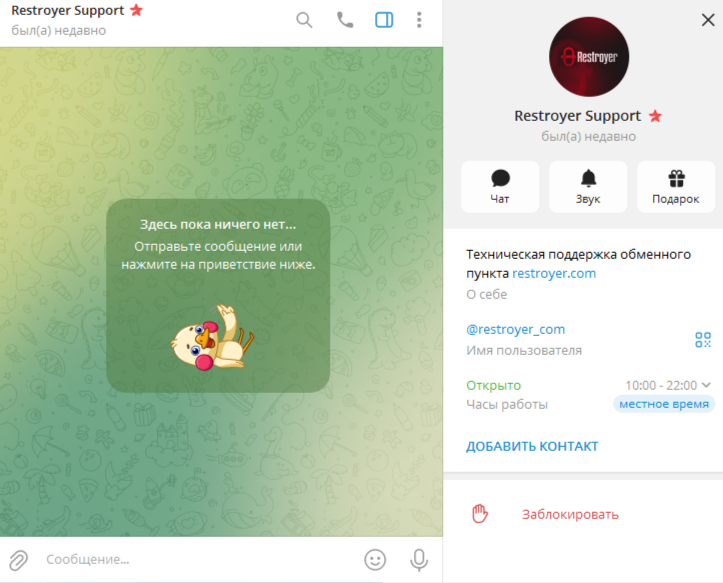 Такая ситуация подтверждает молодой возраст источника и его нелегальную работу. Судя по тому, что сайт и телеграм-аккаунт ведутся на русском языке, плюс, поддержка работает по часовому поясу Москвы, источник был задуман для жителей России, но лицензии ЦБ РФ у него нет.Деятельность Restroyer Com