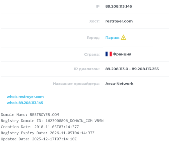 Когда, где и кем был создан источник – непонятно. В характеристиках домена видно, что произошло это в ноябре 2010 года во Франции. Обновление у него было 17 декабря 2025 года со сроком работы – 1 год. Это небольшой период, показывающий несерьезность авторов по отношению к данному делу.