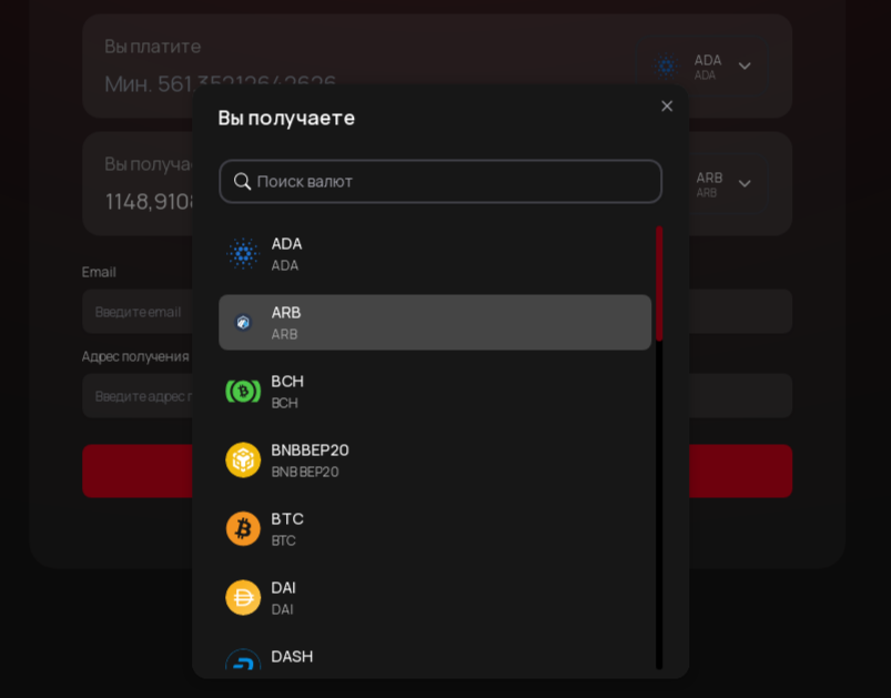 На главной странице Restroyer Com расположено окно для обмена. Для совершения операции нужно выбрать отдаваемую и получаемую валюту. В этих списках указываются одни и те же активы. Это 25 цифровых валют, фиатных нет.