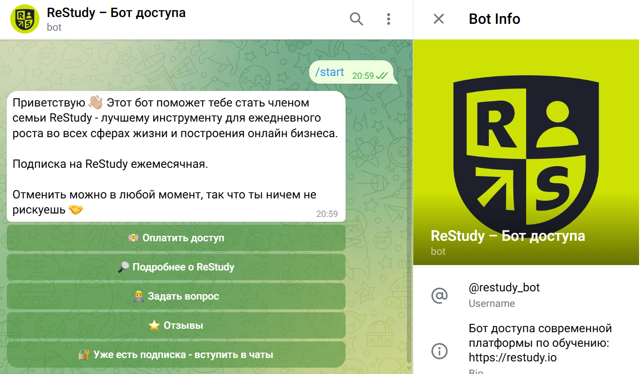У онлайн школы есть Restudy_bot, через которого можно оплатить доступ к образовательным программам платформы. Здесь же пользователь может перейти в чат с отзывами. Однако живых откликов от настоящих юзеров ожидать не стоит – все отзывы публикуются исключительно админом. Купившие подписку также получают доступ к сообществу Restudy club.