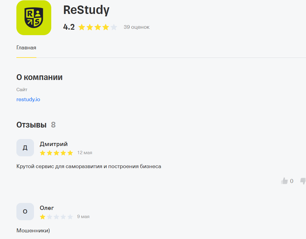 Отзывы о сервисе Restudy io в сети практически отсутствуют. На одном ресурсе мы нашли десятки оценок, а единицы комментариев здесь достаточно противоречивые. Оценка “крутой сервис” чередуется с лаконичным мнением – мошенники.