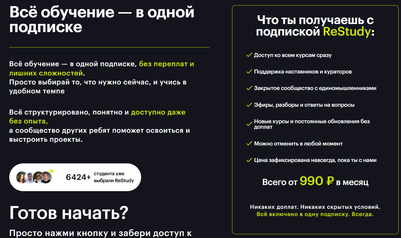 С приобретенной подпиской пользователь получает доступ ко всем обучающим программам, представленным на платформе. На сайте указано, что обучение составляет от 990 руб. в месяц, однако это цена при единоразовой оплате суммы 11 890 руб. за весь год. Также можно оплатить 1 месяц за 1 990 руб., или полгода за 7 990 руб.