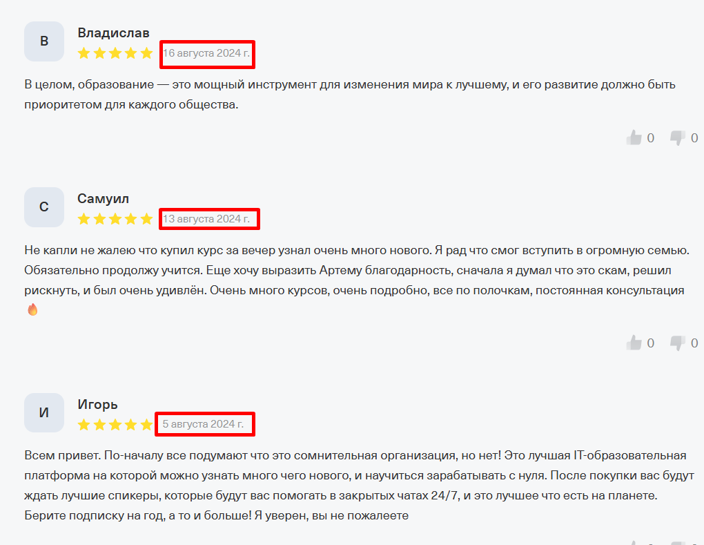 Отклики других пользователей вообще под сомнением. Комментарии откровенно рекламного характера оставлены в августе 2024 года. Складывается впечатление, что в другие периоды обучение просто не проводилось.