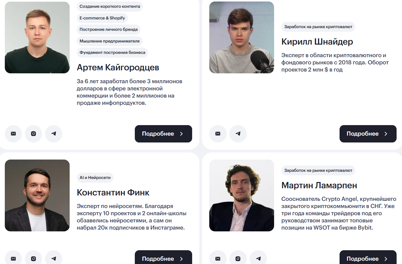 Разработчики площадки обещают, что программы подходят для новичков и на каждом курсе у ученика будет возможность изучить базовую информацию прежде, чем перейти к более углубленному изучению материала. На сайте презентуются 14 преподавателей, однако сканов документов, подтверждающих профессиональные знания лекторов, нет. У спикера по трейдингу, например, отсутствует верифицированная статистика сделок, поэтому ученики не смогут убедиться в его практических навыках, а “продавать рынок” в современных реалиях стремится масса жуликов.