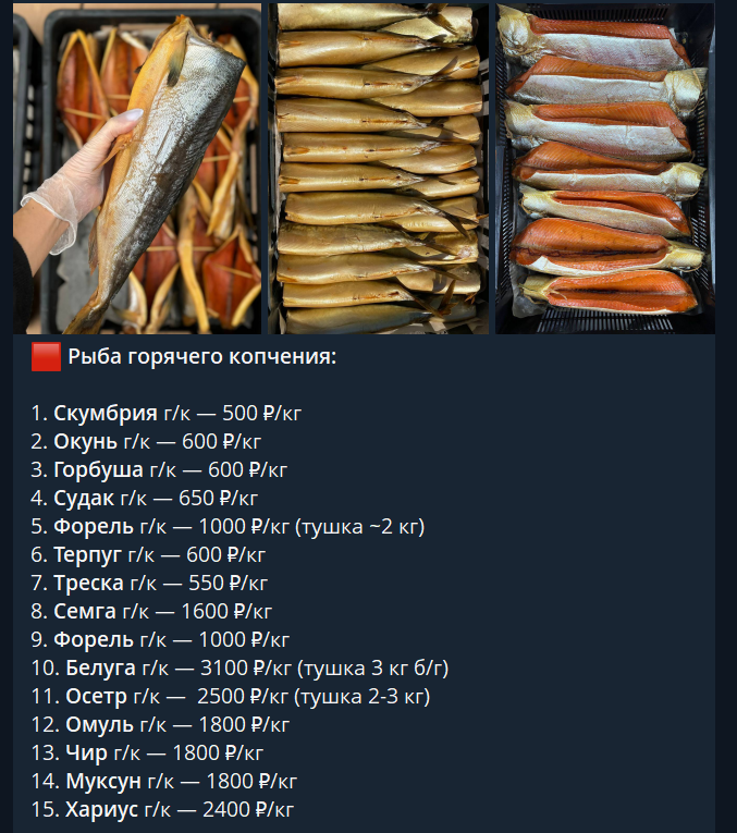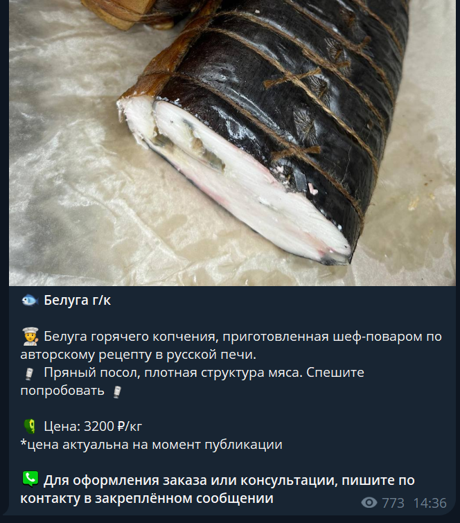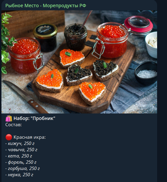 Заранее предупреждают, что оплачивать товар нужно непосредственно при оформлении. Требуется полная предоплата, поэтому наложенный платеж и прочие условия с частичной оплатой тут недоступны. Администрация уверяет, что продукция будет в холодильнике даже во время перевозки. Для транспортировки применяют термо-пакеты, термо-коробы и специальные рефрижераторы для крупных заказов. Цены в постах указываются за 1 кг товара. Менеджер Долбилова Анастасия Ивановна может принять сборный заказ, чтобы дополнить его до нужной суммы.Телеграм-канал «ООО Рыбное место» предлагает покупателям икру, рыбу, деликатесы из морепродуктов с северных областей РФ. Каждый день появляются новые товары. В постах указывают актуальные цены, фотографии и добавляют описание, что позволяет выбрать подходящий вариант. Но при этом документы о регистрации и прочие юридические сведения данной организации отсутствуют.