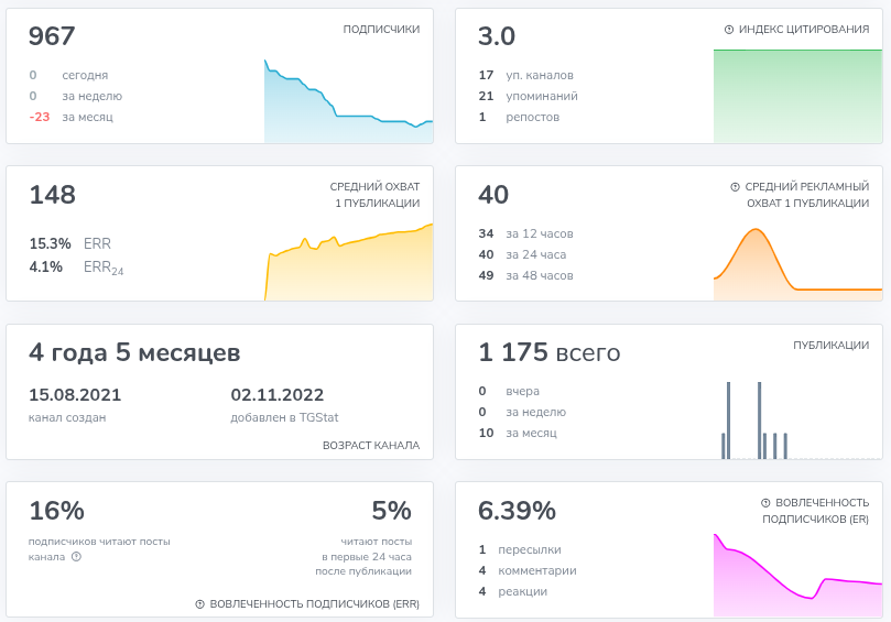 Если же взглянуть на статистику через TGStat, то оптимизм улетучивается. Канал явно в стагнации: график подписчиков показывает отрицательную динамику, люди медленно, но верно уходят. Вовлеченность (ER) болтается в районе 6%, что для авторского блога с претензией на экспертность — очень слабый показатель.