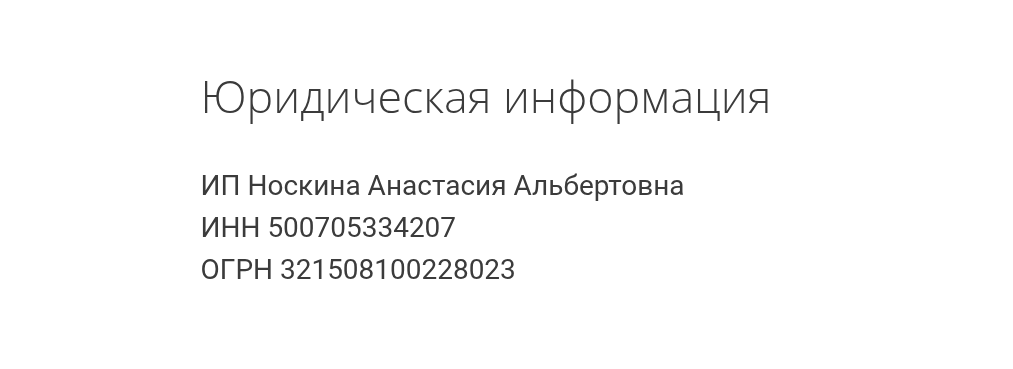 В отличие от большинства анонимных гуру, здесь мы видим вполне реальное лицо. Автор проекта работает в белую: ИП Носкина Анастасия Альбертовна (ИНН 500705334207) официально зарегистрирована и платит налоги. Ваши деньги идут на расчетный счет, а не на криптокошелек дропа, поэтому юридически проект легитимен.