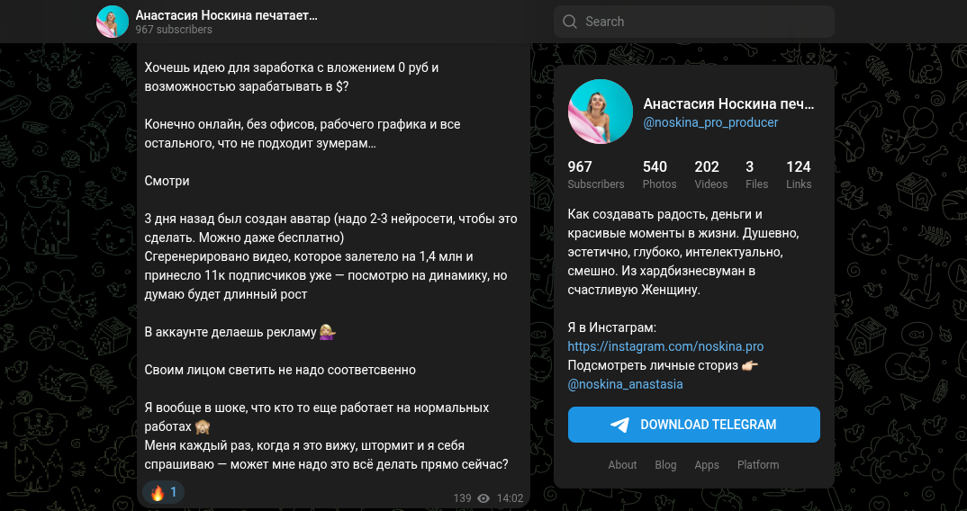 Основной рупор проекта — канал Noskina Pro Producer в Телеграмм. Контент в ленте паблика сугубо женский, «ванильный», с прицелом на жесткий прогрев аудитории. Посты чередуются по классической схеме: то мотивация в стиле «ты достойна лучшего», то агрессивные продажи интенсивов и мест на наставничество. Автор старательно создает видимость активного комьюнити: