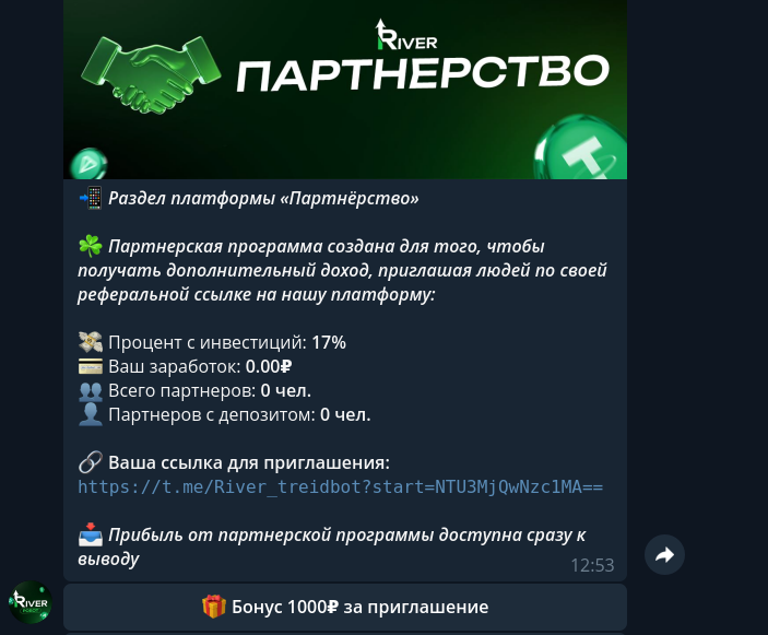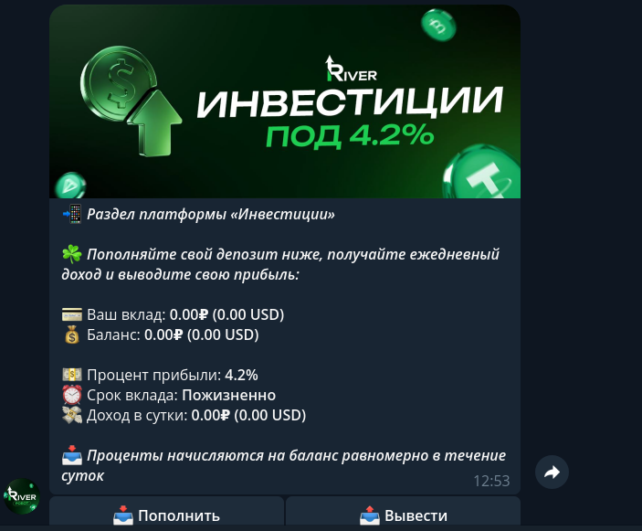 Как видите, River Treidbot — это обычная финансовая пирамида, просто запустили ее в мессенджере под видом арбитражного Telegram-бота. Проект эксплуатирует популярную тему заработка на крипте, но не имеет к ней никакого отношения.