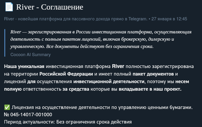 Еще один критический момент в правилах River Treidbot — условия входа и участия. Вклад считается «пожизненным», то есть тело депозита инвестору не возвращают. Вы отдаете свои деньги безвозвратно в бессмысленной надежде отбить их за счет процентов. Учитывая, что подобные проекты живут от силы пару недель или месяцев, риск не выйти даже в безубыток колоссальный. Фактически, вы дарите крипту мошенникам в обмен на цифры на экране.