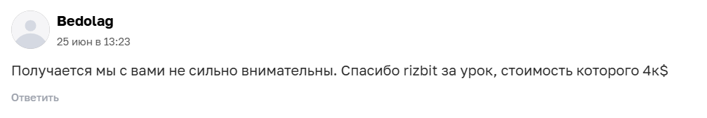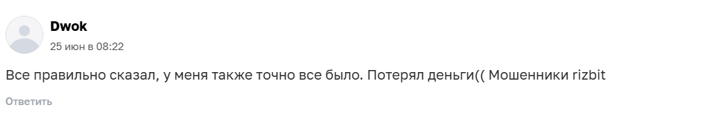 О бирже Ризбит отзывы найти сложно, так как проект быстро закрылся. Однако несколько комментариев все же есть. Например, здесь человек пишет, что потерял из-за Rizbit деньги:
