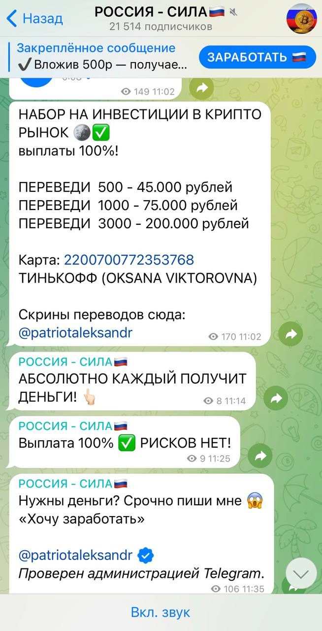 Россия Сила трейдер – блог в Телеграме, посвященный раскрутке депозитов. Таких каналов в афериста Александра много, он обманывает клиентов, заманивая их перспективой большого заработка. Помимо этого, он также управляет блогом Za Русских, где используется аналогичный развод.