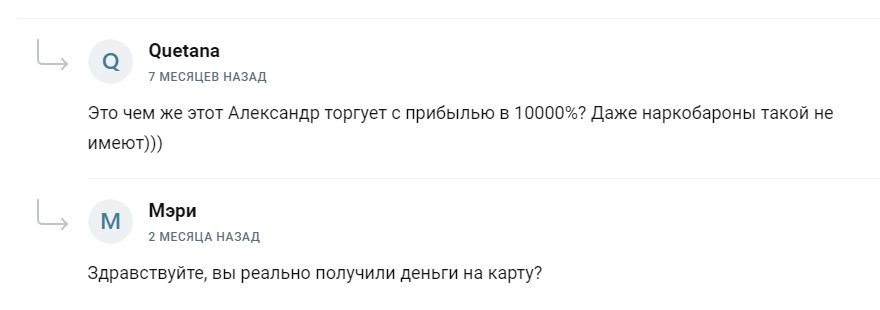 Предоставляемая на платформе информация ничем не поможет инвесторам: отсутствуют обучающие материалы, аналитические обзоры или консультации. Александр не только присваивает себе деньги пользователей, но и утверждает, что для защиты депозита необходимо дополнительно оплатить 10% от обещанной прибыли, которые нужно внести заранее, еще до начала сотрудничества.