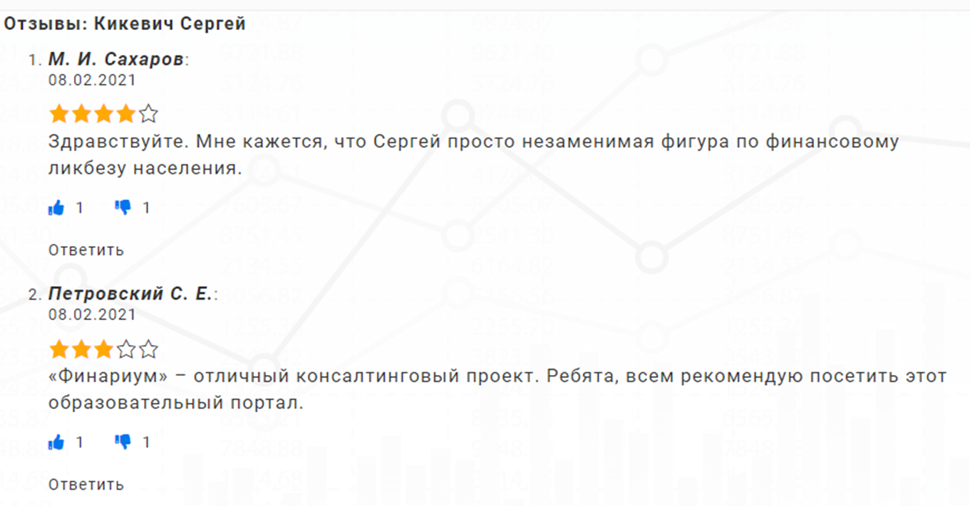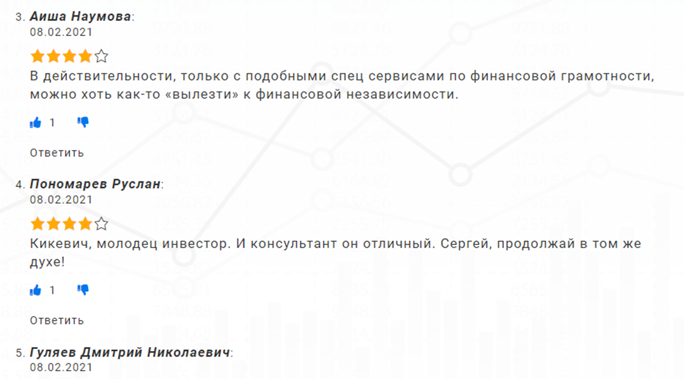 На Rostsber и все проекты Сергея отзывы на форумах исключительно положительные. Пользователи считают, что Kikevich отличный инвестор и специалист по финансовой грамотности, а его курсы очень полезны.