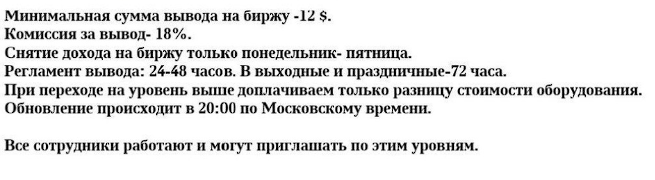 На выбор пользователям предлагается семь тарифных планов. В максимальном тарифе придется пополнить счет на сумму от 30 тысяч долларов. За эти деньги клиент получает 160 устройств, а его ежедневный доход составляет 864 доллара.