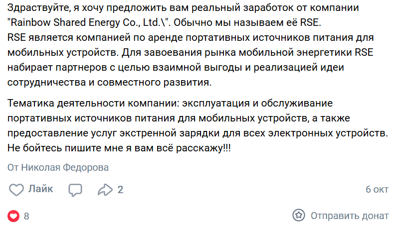 Rsecsc — очередная финансовая пирамида, в которой обещают легкий и стабильный доход. Пользователям внушают, что в век развития технологий не нужно сидеть в офисе и пропадать на работе с 8 до 18. Достаточно вложиться в портативные устройства для зарядки смартфонов, которые постоянно разряжаются. Однако, все «сказки» о прекрасном будущем и заработке в Rse — всего лишь способ вовлечь людей в очередной скам. Инвестировать в проект не рекомендуется.