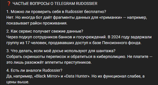 В Телеграме Rudossier создатели обещают всего в несколько кликов получить нужную информацию. За этой кажущейся простотой скрываются серьезные риски. Это нарушение конфиденциальности. Личные данные могут оказаться в руках третьих лиц. Один из пользователей в отзывах о Rudossier сообщил, что его данные были слиты неизвестными лицами. Это вызывало у него серьезные опасения.