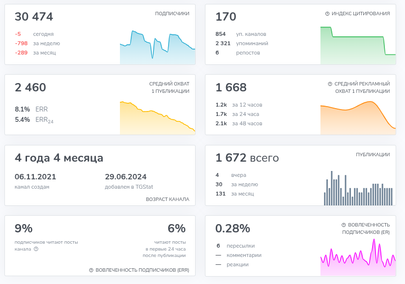 - Количество подписчиков перевалило за 30 474 человека, но средний охват одной публикации еле дотягивает до 2460 просмотров.