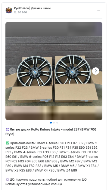 Сначала телеграм-канал «РусКолеса | Диски и Шины» активно прогревает аудиторию постами с фотографиями эксклюзивных дисков. Прайс выставляют заведомо нереалистичный. Например, дельцы предлагают забрать полный комплект за 42 тыс. рублей, тогда как в реальности ровно столько стоит один оригинальный каток в официальном магазине.
